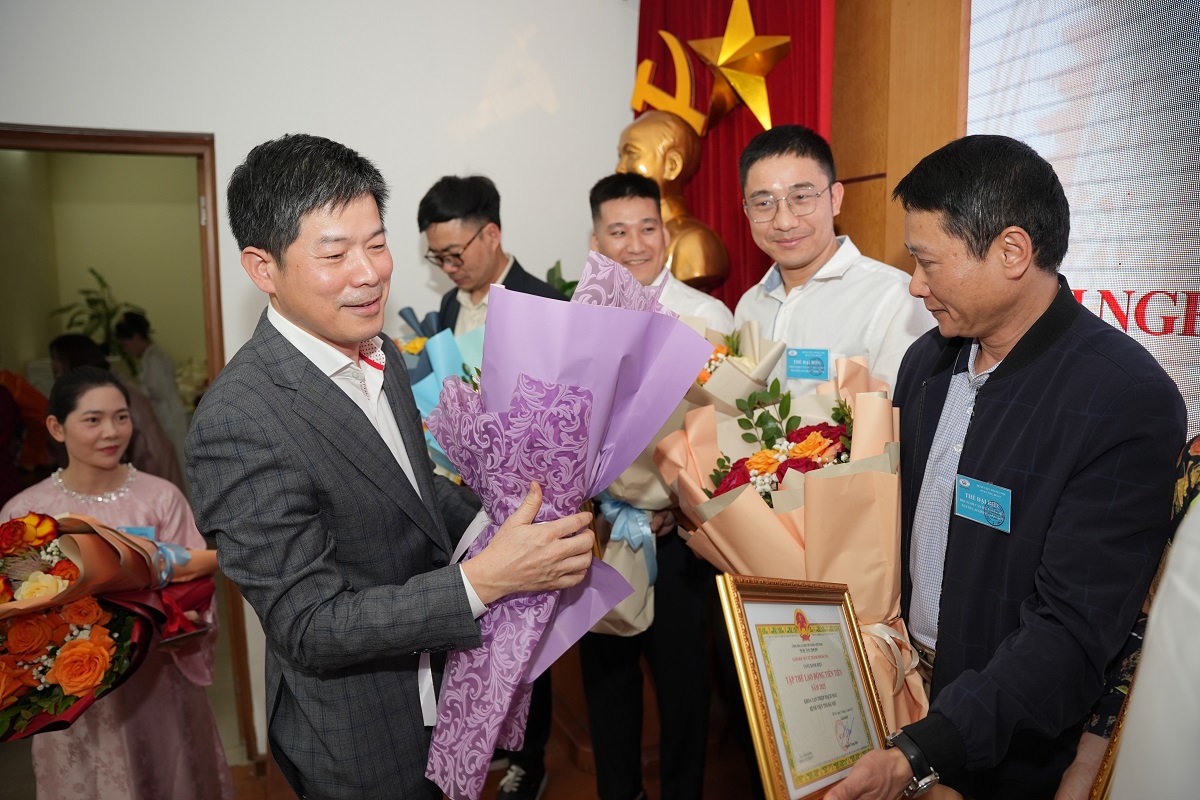 TS.BS Nguyễn Trọng Diện - Giám đốc Sở Y tế Hà Nội và PGS.TS Nguyễn Sinh Hiền – Giám đốc Bệnh viện Tim Hà Nội trao bằng khen và hoa cho các tập thể Bệnh viện Tim Hà Nội có thành tích lao động tiên tiến trong năm 2025.