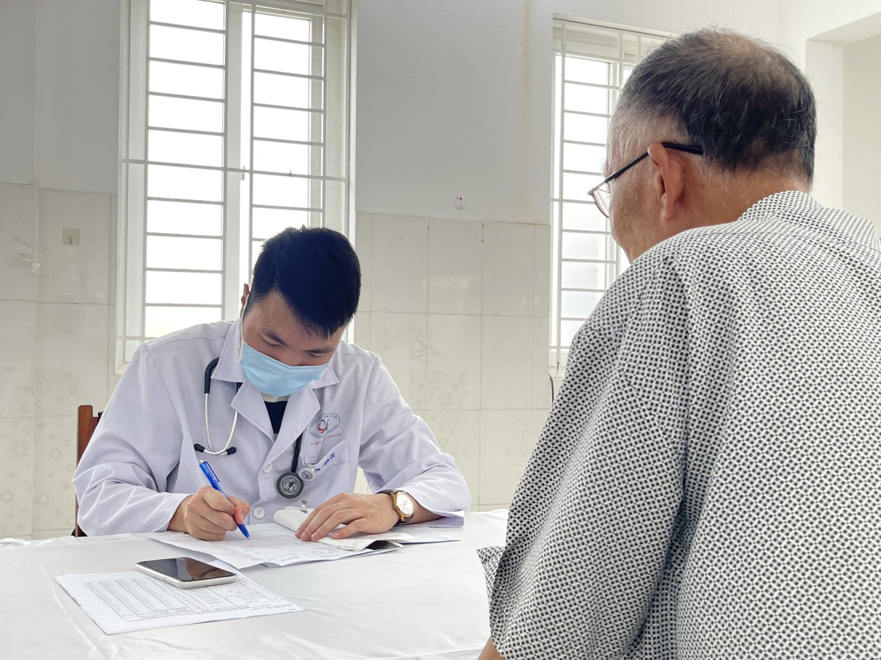 Các bác sĩ trẻ thuộc Bệnh viện Tim Hà Nội khám, tư vấn sức khỏe cho các đối tượng chính sách trên địa bàn huyện Đan Phượng.